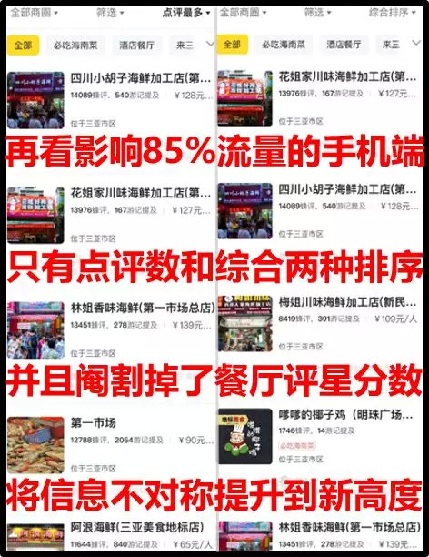 当切换到手机APP时信息更加不对称,虽然马蜂窝85%的访问量来自移动端(4),但用户的浏览选项只剩综合名次与点评数量两种排序方式,还隐去了餐厅的综合评分,除非用户亲自点击查看具体商户,从成千上万条“好评”中提取信息,给了黑心商家们更多可乘之机。