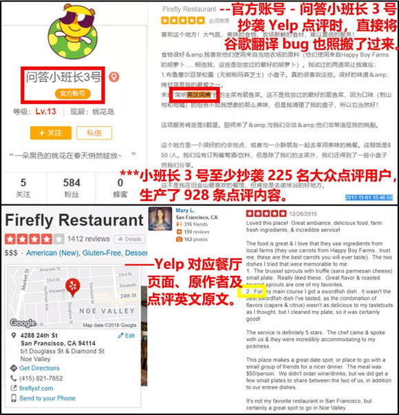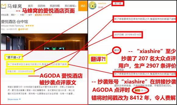 平均下来,每个抄袭账号都一字不差地照抄了212位不同大众点评用户的餐饮评价(每位至少被抄一条),海外餐饮点评则抄袭或使用谷歌翻译自Yelp,还有大量酒店评价也可直接追溯到携程、艺龙、TripAdvisor、Agoda等网站。
