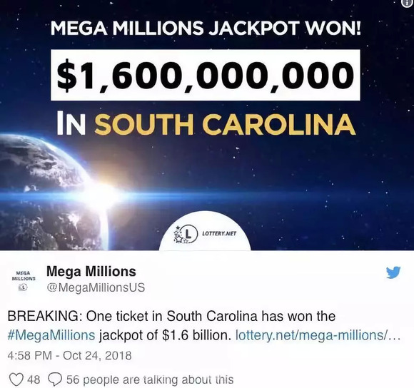 10月24日,南卡罗莱纳州教育彩票(Education Lottery)网站宣布,有一张中头奖的彩票在该州售出。奖金累计到了惊人的$16亿美金。