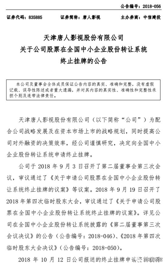 10月23日,唐人影视发布公告称,唐人影视的股票自2018年10月24日起,终止在全国中小企业股份系统挂牌:“为配合公司战略发展及在资本市场上市的战略规划,同时提高公司对外融资的决策效率,经公司谨慎研究,决定向全国中小企业股份转让系统申请终止挂牌。”