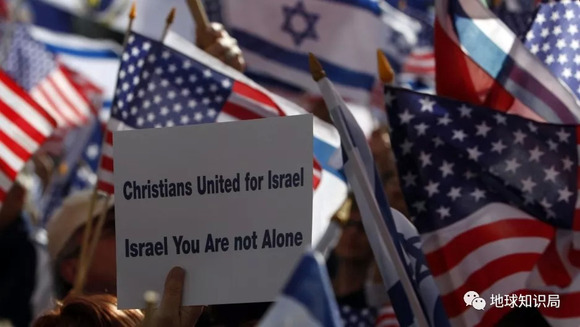 以新教立国的美国,其中的福音派在20世纪成为主要组成部分。美国福音派基督徒号称组成了全美最大的亲以色列群体,对以色列的支持比犹太人更甚。比如2014年皮尤的一项民调显示, 约82%的美国白人福音派基督徒认为, 上帝把以色列给予犹太人, 反观犹太人中只有40%认可这一神学观点。