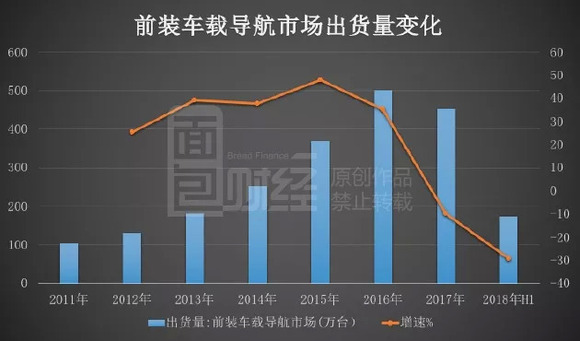 根据wind数据,2017年前装车载导航市场出货量453.22万台,同比下滑9.68%。今年上半年,前装车载导航市场出货量进一步萎缩,同比下滑29.26%。以下为根据公开数据绘制的前装车载导航市场出货量变化: