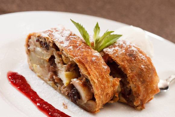 奥地利相当出名的一道甜点。用质地偏硬,口感偏酸的苹果做主料,加入黄油、柠檬汁、鸡蛋等合成陷,用薄面皮包成卷后在烤箱里烤制而成。烤好的苹果卷冒着热气,在嘴里迸发出酸甜的味道,让人无法抗拒。