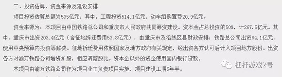 原文是这么说的:本项目由中国铁路总公司和重庆市人民政府共同筹资建设。资本金占总投资的50%,计267.5亿元。其中,重庆市出资203.4亿元(含征地拆迁费用53.8亿元),由重庆市及沿线区县财政安排;铁路总公司出资64.1亿元,使用中央预算内投资等解决。