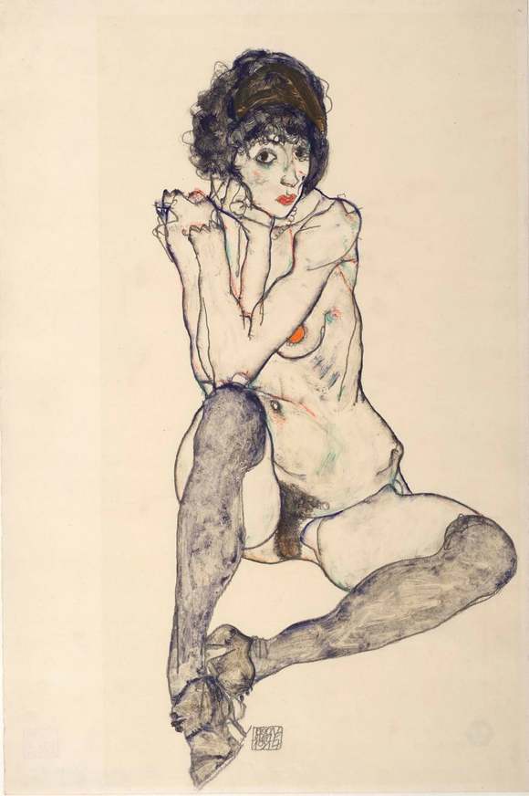 一个穿着黑色袜的女人斜倚在大腿上,直勾勾地盯着席勒,毫不避讳,红色的乳头裸露在外。这样的图景既满含深意,又充满情色意味。画中的模特骨瘦如柴,肉体染上了几份奇异的哥特色彩。这幅画毫无保留地记录了两人相遇时的情形,少女的人性和脆弱也显露无疑。对席勒来说,性就是依然活着的标志。