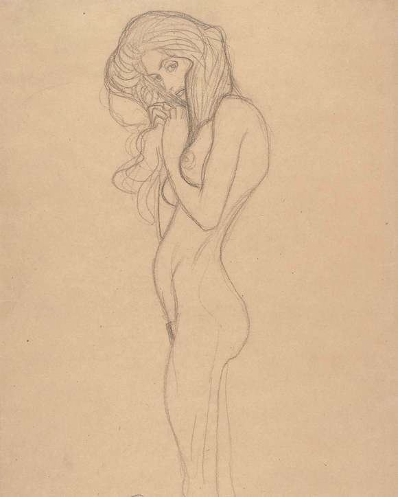 他们创作出一幅幅经典,同时也在讲述着审查制度和为之牺牲的故事。克里姆特的《医学》(Medicine)手稿布满了密密匝匝的铅笔和木炭线条,就像一个交错纠结的梦境,等待弗洛伊德的解读:左边的女人浑身赤裸,一头蓬松的黑发散落下来。另一边,人类的身体蜷曲拥抱,互相纠缠,组成一座摇摇欲坠的高塔,一具骷髅在中间满脸狞笑。这出灵动的生与死的悲喜剧创作于1900年,算得上是克里姆特所接过的最大的活儿了——他要把这幅画画在维也纳大学的天花板上。后来,克里姆特因这幅画被指控传播色情信息,1945年,它差点就毁在了纳粹党卫军的手上。