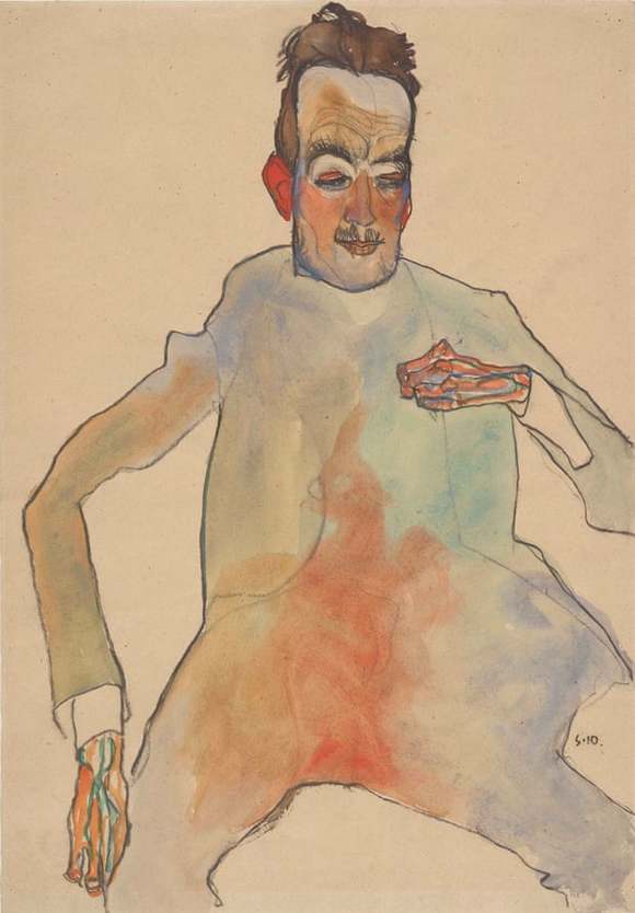 席勒对自己身体的尖锐观察其实是一种对生活的精简,将其削减到只剩必需品。要么大方展示出自己肌肉饱满、轮廓鲜明的猩红色背部,要么将自己裹进长长的白衬衫里,描绘成一只笨重的怪物。他删掉了所有的社会习俗、服装和礼节,将个体的存在剥离到最基本的元素。而席勒丝毫没有怀疑,这些生活必需品就是性和死亡。