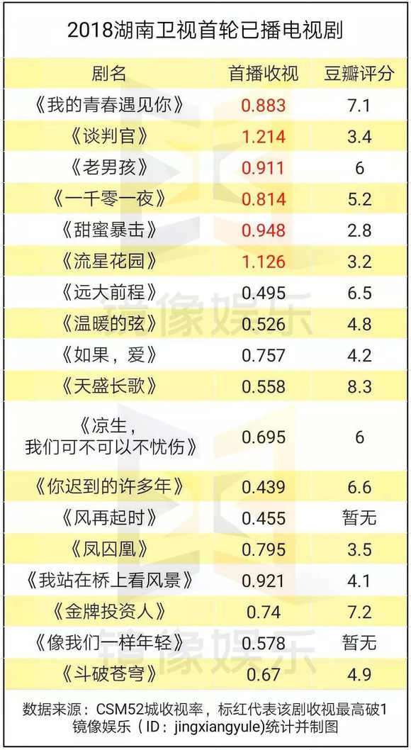 从湖南卫视已经播出的18部电视剧来看,仅有6部收视破1,占比为33%。其中,作为开年剧的《谈判官》在春节的收视红利下仅拿到1.214的首播收视,而同期由东方卫视和江苏卫视拼播的《恋爱先生》单平台收视破2。而且,其收视破1的剧集整体口碑较差,《谈判官》《甜蜜暴击》《流星花园》豆瓣评分都在3分上下。