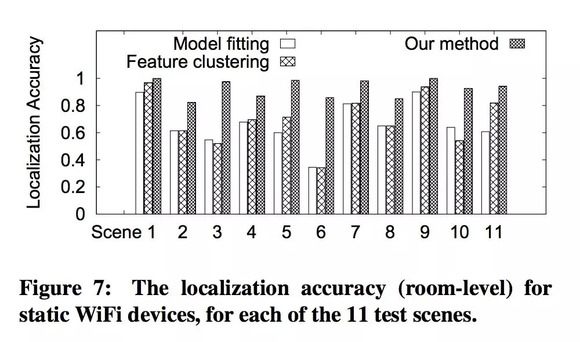 为了评估第一步的攻击,我们处理了所收集到的RSS跟踪,用以检测和定位目标区域中的固定WiFi设备,并将结果与事实进行比较。图7是11个测试场景中的每一个WiFi设备的平均定位精度。我们比较了使用和不使用数据筛选的RSS模型拟合的性能,以及应用中所提出的特征聚类时的性能。