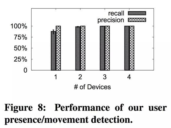 检测房间中的用户存在。图8描述了在我们的测试场景中,基于12小时CSI记录中的用户存在/移动检测的CSI性能。我们根据房间中锚固装置的数量,得到了精度和召回值结果。我们的攻击探测器非常精确,在室内分别使用一个、两个和三个锚固装置时,召唤值分别为87.8%,98.5%和99.8%,三种情况下的精确值均为99.95%。但仅使用一个锚固设备,召回值较低,因为用户可能离设备更远,因此他的移动对嗅探的CSI信号带来的可观察影响就较少。随着房间内锚装置的增加,攻击覆盖范围也将迅速增大。