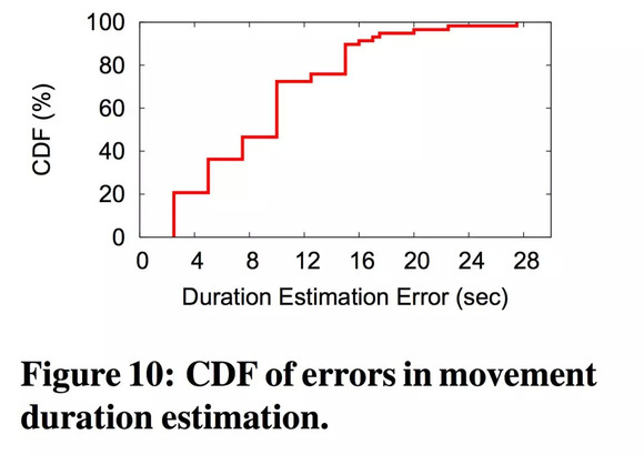接下来,使用所有记录的CSI迹线,我们通过将每个检测到的、移动的持续时间与用户记录的地面实况值进行比较。以分析跟踪精度。图10显示了CDF的持续时间估计误差,其中80%的情况下,误差小于16秒。