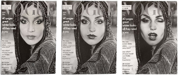 1975年,舍曼创作了“封面女郎”系列(Vogue)。她分别拍摄了杂志的原版封面和自己的肖像,然后通过剪切、拼贴、双重曝光制造了以假乱真的杂志封面。在原版封面之后,她先是用和原杂志封面模特相似的妆容来迎合、模仿,继而露出搞怪的表情搅碎原照的语境。从艺术生涯的开端,舍曼就从揭示视觉欺骗和虚假中建立起自己的艺术,质问大众文化对个体的规训。然而事情的吊诡之处或许在于,舍曼的作品本身也成为了大众文化的一部分,成为她批判的对象。但这已经不是艺术家的镜头所能聚焦的了。