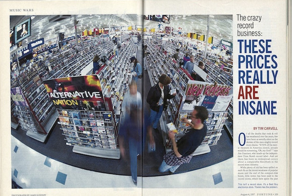 在《疯狂的唱片业》中有一组关于传统唱片连锁行业的数据很有意思。卡维尔发现CD确实点燃了音乐行业新一轮的爆发,音乐零售门店的数量从1987年的5503家暴增到1992年的7014家。但随着竞争加剧,短短五年后就有7家大型连锁店相继破产。