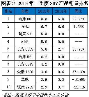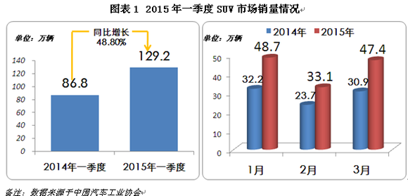 2015年3月SUV市场销售47.4万辆,同比增长53.57%;一季度SUV累计销售129.2万辆,同比增长48.80%。