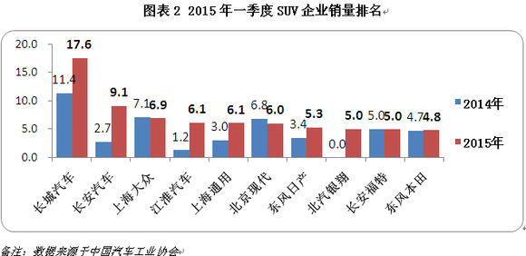 2015年一季度SUV累计销售129.2万辆,同比增长48.80%。自主品牌表现不俗。