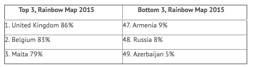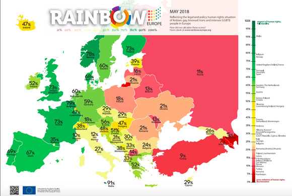 在此之前,苏格兰也一直是欧洲乃至全世界范围内,对LGBTI群体宽容度最高、最友好的地区之一。2015年,在同性恋人权组织“国际同性恋、跨性别者及兼具两性特征者协会”(ILGA)发布的“彩虹指数”中,苏格兰地区以92%的水平排行第一,高于英国整体水平(86%)。