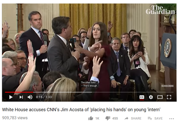 11月7日当天,白宫方面吊销了阿科斯塔的通行证。更令CNN费解的是,白宫新闻秘书桑德斯(Sarah Sanders)在11月8日的推特上放了一段特写慢动作,使阿科斯塔看起来将手放在了女实习生胳膊上很长时间。白宫方面的解释是,“这种不检点的行为不能容忍”。这一指控显然使CNN难以接受。