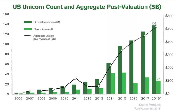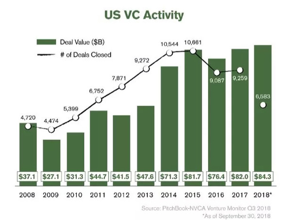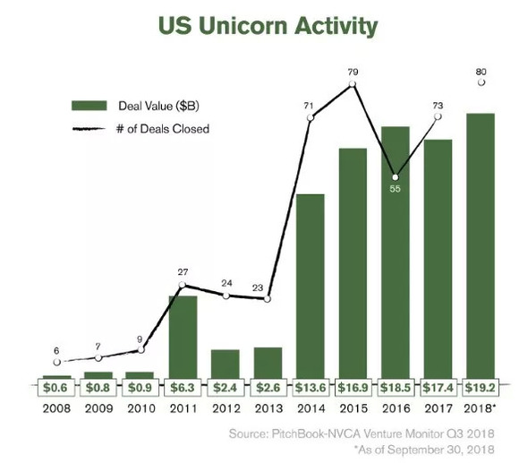 在2018年的前九个月中,独角兽企业吸引的VC资金总额达到了惊人的192亿美元,已经打破了2016年全年185亿美元的纪录!事实上,从交易额度来看,2018年的前九个月的VC交易总额已经超过了历史上的任何一年的全年纪录。