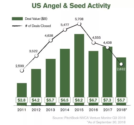 VC天使和种子轮的投资活动预计将创下2014年以来的最低纪录,交易数量大幅减少。如果这种趋势在2018年继续下去,那么自2015年天使和种子融资数量达到最高点以来,到今年年底将下降51%,已遭“腰斩”。
