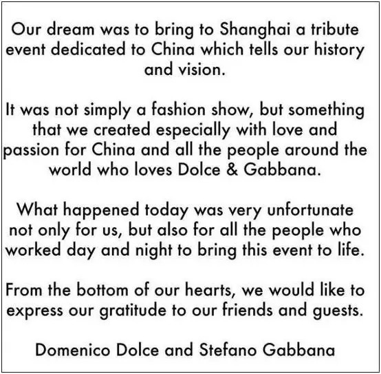 有网友表示,D&G官方这份声明没有任何诚意并且十分傲慢,用到最重的词是“gratitude”,且是对准备大秀的朋友和嘉宾表达愧疚,全篇没有对中国以及中国人民的道歉。