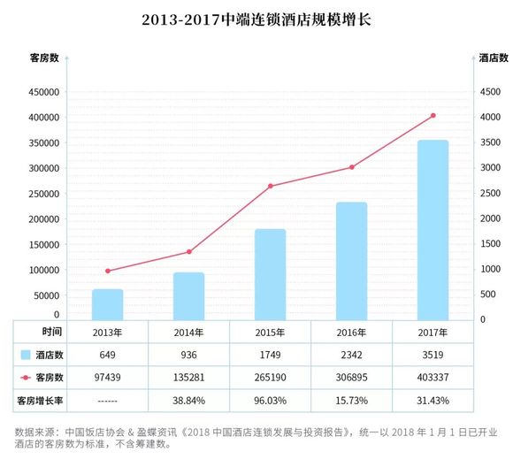 中高端酒店成为中国酒店业翘首以盼的风口。据统计,从2014年到2017年,我国中端连锁酒店客房从13.5万间飙升至40.3万间。