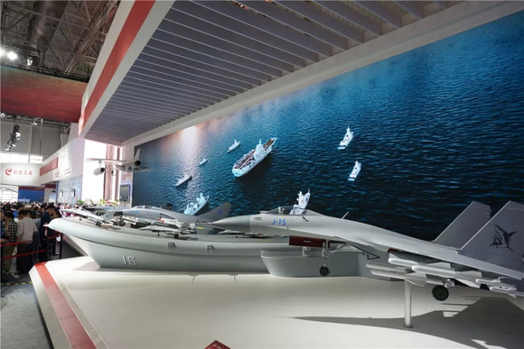 先走进主场馆里看看,一入正门就是中航工业的主展位,几乎目前所有的国产主力战斗机都在这里亮相了,只不过全都不是实机,而是相应的比例模型。譬如歼-15、歼-10B、歼轰-7E等等。