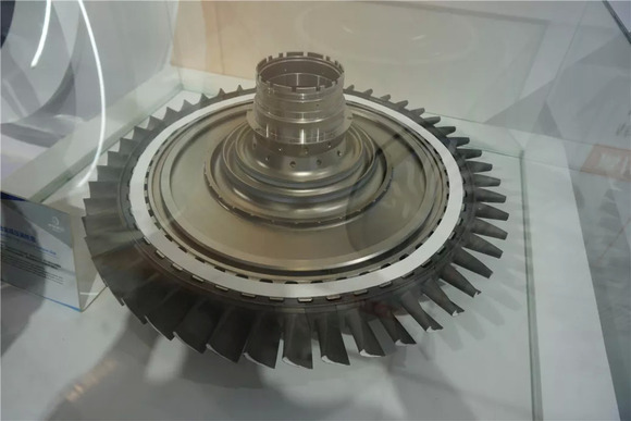 除了动力总成之外,核心零部件也是一大看点。来看看这个涡轮盘总成,它应该是航发中最核心的部件之一了。中央的部分采用的是粉末高温合金锻造的工艺,而周围的叶片似乎是铸造之后组装起来的。如果放大仔细看的话,可以看到每个叶片上都有排列整齐、十分细小的散热气孔,不知道是怎么做到的呢?太神奇了。