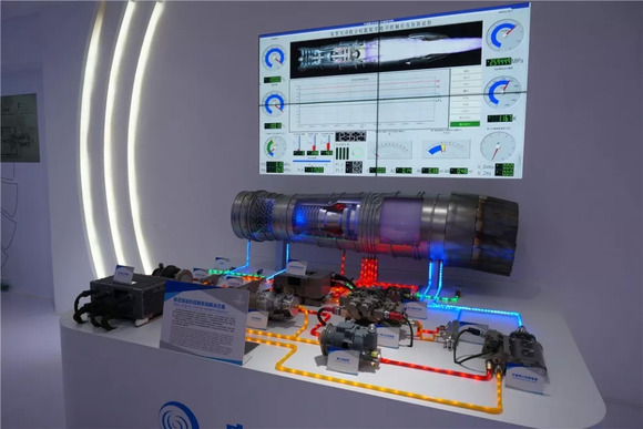 各类系统模型的展示也是一个很好的看点。这里展示的是涡扇发动机的控制系统模型,可以看到,整套系统的所有泵体和管路一览无余。注意到了吗,这台发动机是带有矢量喷口的,上方还附带了系统仿真的虚拟仪表界面,整个展示做得很良心吧……