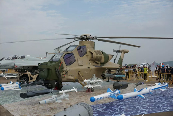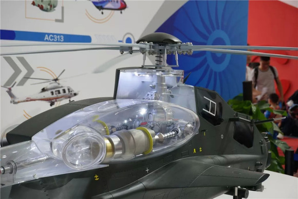 直-10ME武装直升机,也是专门针对外贸出口的型号,换装了新的大马力发动机,进气道加装了防尘罩,而且排气口改成了朝上的样式,可以让旋翼打散带热量的尾气,增强隐身性能,还可以挂载专门用于侦查的无人机。