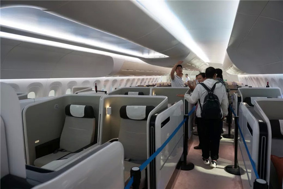 真正的看点就是它了——CR929的1:1客舱展示模型,每天有固定的开放时间,一到点排队的地方就人山人海了。