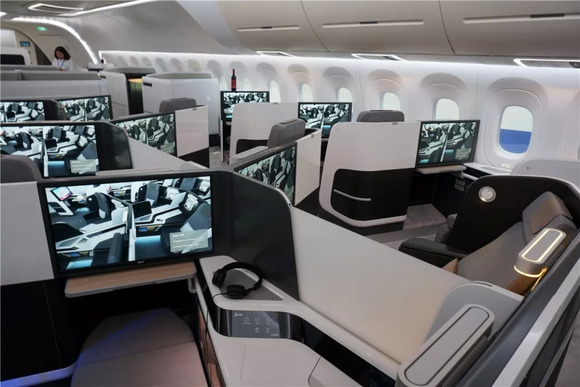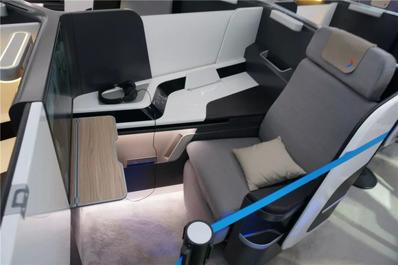 CR929头等舱的设计相当华丽啊,不但有常规头等舱的电动可调角度的座椅,而且带有大面积的液晶屏、折叠小桌板、还有液晶触控面板,脚底带有储物格。