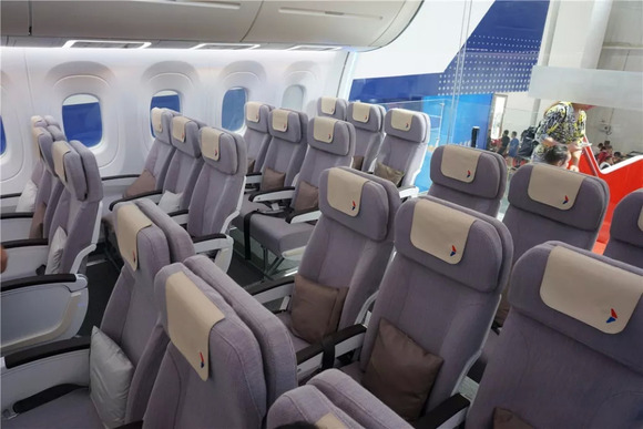 二等舱的座位设计就比较普通了,采用的是每排八座的设计,和其它普通客机别无二致。