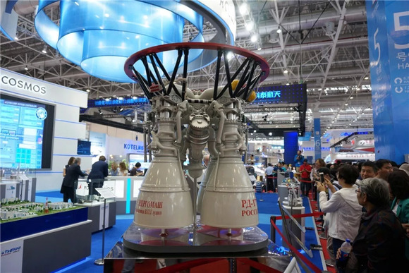 而俄罗斯联邦航天局(ROSCOSMOS)的展位就很值得一看了。RD-171M,用于天顶-3、安加号的液体燃料火箭发动机,推力800吨力,将近2.0的推重比,似乎也是现役推力最强的火箭发动机吧。