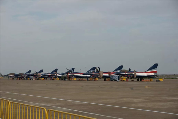 来航展又怎么能少了飞行表演队呢?这是我们空军的“八一”表演队,清一色的歼-10列装,已经表演完收队了,只能隔着大老远看看。