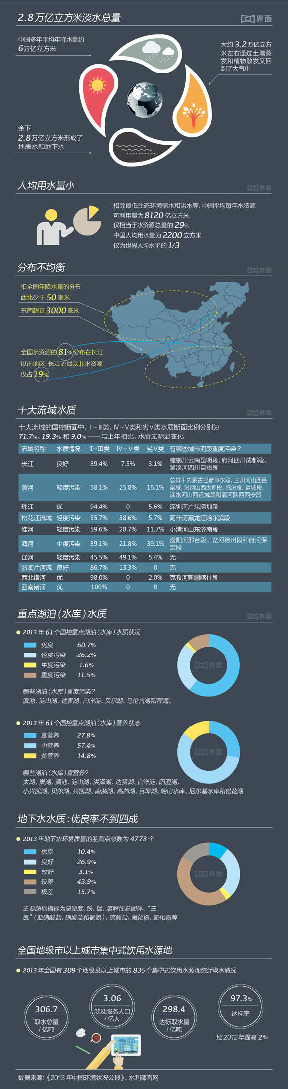 中国近日出台了一份严厉的水污染防治计划。在发布这份计划的同时,环保部门指出,中国水污染的严重状况仍未得到根本性遏制。界面通过一张图让你对中国水资源和污染状况一目了然。