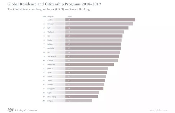 Henleyglobal于今年10月公布的第四版《年度全球居留和入籍项目报告》中指出,在2018-2019全球居留权项目指数(GRPI)中,葡萄牙黄金签证居留计划以77分(满分100分)的亮眼成绩,排名第二,超过意大利、英国、瑞士等国的居留许可项目。