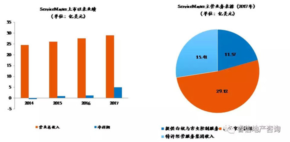 与 FirstService 有所不同,ServiceMaster 专注于基础物业服务,特别是细分领域的物业服务市场。如果拿中国的视角来说,这是一家和物业服务相关的专业性服务公司,聚焦范围窄。不过,相比中国的家政、保洁行业的公司来说,ServiceMaster 和客户的粘性又更强,服务品类又更宽,和客户连接更紧密。公司主要的业务可以分为白蚁及害虫防治服务、住房保修服务及特许经营加盟品牌。
