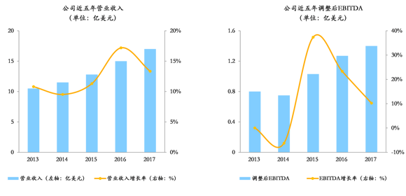 公司曾于 1962 年首次上市纽交所,后在 2007 年私有化退市,又于 2014 年 6 月重新上市。2011-2017 年间,公司营业收入复合增长率为 5.56%。2017 年,公司的营业收入达到29.12 亿美元,EBITDA 达到 6.68 亿美元。