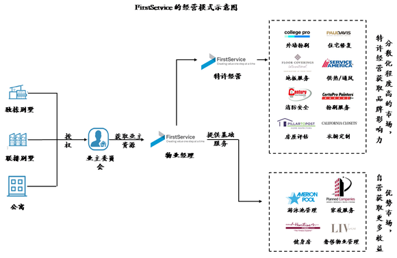 FirstService 的模式是物业经营与基础服务并重,其通过两大平台服务客户。分别是住宅平台 FirstService Residential,是北美最大的住宅物业管理经理人;品牌平台 FirstService Brands,是北美最大的基础服务供应商之一,其通过特许经营系统为住宅和商业地产提供服务。FirstService 通过两大品牌系统紧密分工,是北美平台型综合物业服务提供商的代表。