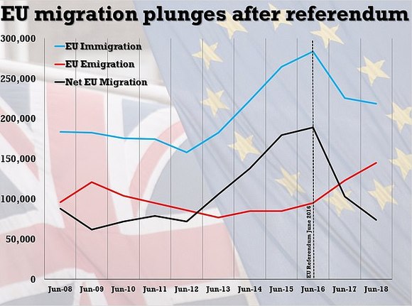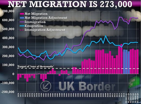 根据报告,截至2018年六月,62.5万移民进入英国,35.1万人离开。英国国家统计署(ONS)称,这代表今年英国的净移民数量约为27.3万人。