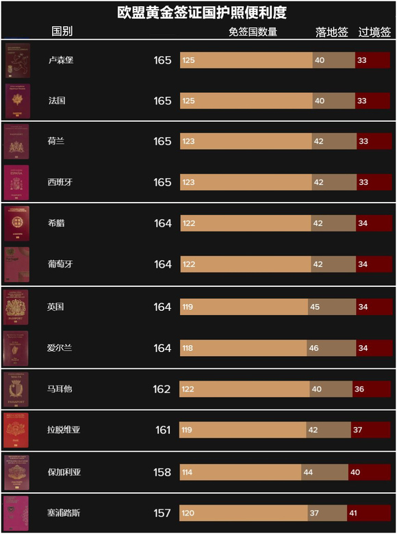 根据咨询公司Arton Capital最新公布的全球护照免签国排名,欧洲身份便利程度相当,卢森堡、法国、荷兰与西班牙公民能免签或落地签的国家数量最多,为165个。希腊、葡萄牙、英国与爱尔兰也不甘示弱,紧随其后,免签或落地签164国。而马耳他则能免签或落地签162个国家。