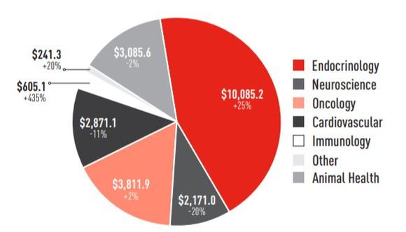 中枢神经部门就没有那么春风得意了,由于失去专利保护,治疗儿童、青少年及成人注意缺陷及多动障碍的择思达 (Strattera)、欣百达和再普乐的销量下降,导致中枢神经部门的收入下降了20%。同样拖后腿的还有心血管部门,Cialis和Effient的销量下降,导致心血管疾病的收入下降了11%。但由于礼来的第一大业务内分泌部门的实现营收101亿,同比上涨25%,抵消了这些业绩下滑。