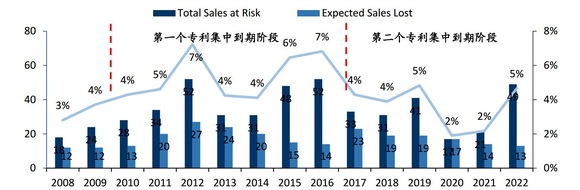 目前,原研药企集体面临专利悬崖的“达摩克利斯之剑”,可能带来千亿美元级别的销售损失。根据EvaluatePhama的统计,2017-2022 将会成为第二个专利集中到期阶段,将可能带来1050亿美元的销售损失,并在未来几年对全球各大药企的销售额产生5%-72%不等的影响。