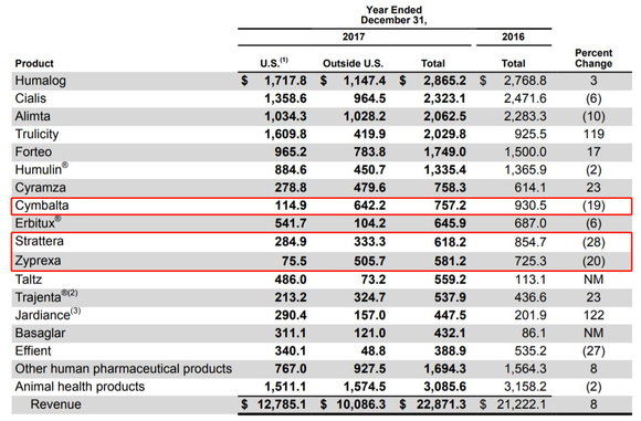 值得注意的是,治疗重度抑郁症的产品欣百达在美国的收入下降了57%,这一部分被日本销量增加所抵消,最后的营收仅下跌19%。另一款治疗注意力缺陷多动障碍的产品择思达也是受日本营收增长带动,美国以外的营收增长4%。