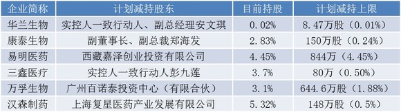 本周华兰生物(002007.SZ)、康泰生物(300601.SZ)、易明医药(002826.SZ)、三鑫医疗(300453.SZ)、万孚生物(300482.SZ)、汉森制药(002412.SZ)等企业股东计划减持,其中易明医药持股持股4.45%的股东西藏嘉泽创业投资有限公司计划清仓减持。该股东已是年内第二次发布减持计划,此前的5月31日其计划减持易明医药不超过2%的股份。