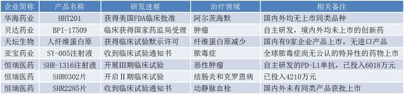 本周华海药业(600521.SH)、贝达药业(300558.SZ)、天坛生物(600161.SH)、亚宝药业(600351.SH)、恒瑞医药(600276.SH)等5家企业、7个产品在临床阶段取得进展。华海药业用于治疗阿尔茨海默的HHT201 获得美国食药监局(FDA)临床试验批准,该产品在国内外均无上市同类品种。