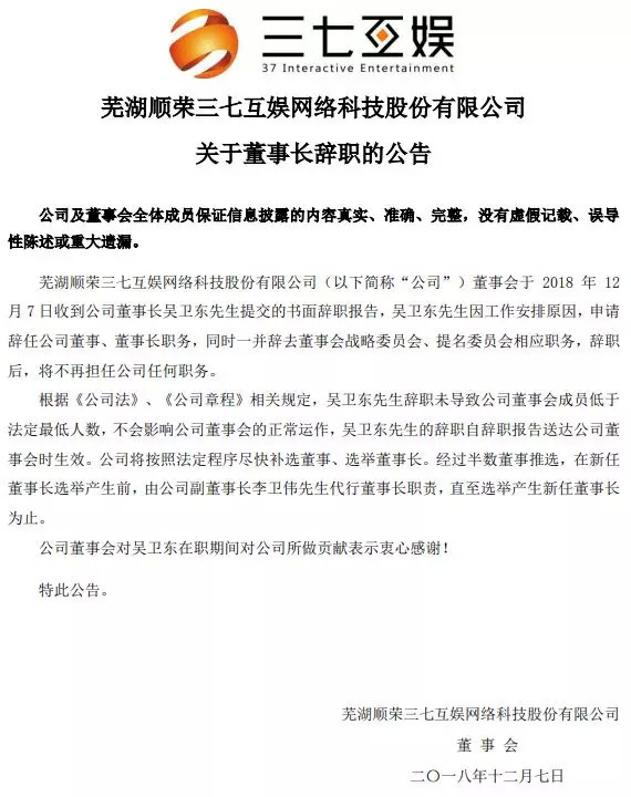 上周五盘后(12月7日),三七互娱发布公告称,公司董事长吴卫东先生因工作安排原因,申请辞任公司董事、董事长职务。与此同时,一并辞去董事会战略委员会、提名委员会的相应职务。并声明在辞职后,不再担任公司任何职务。