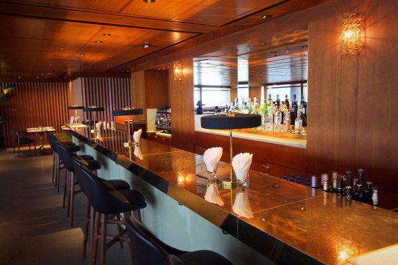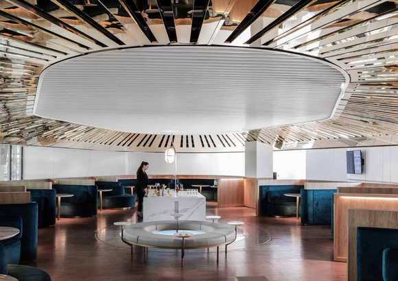 休息室另一处抢眼的空间是Le Balcon酒吧,设计师Mathieu Lehanneur在酒吧中心上方设计了弯曲的巨大金色镜面吊顶,并在木地板上镶嵌了一块集成LED屏幕,来描绘天空的景象,从天亮到黄昏跟随天空的颜色逐渐变化,让上下成为一个整体,表达着设计师的语言——“悬浮在天堂和天空之间,时间似乎停滞不前的空间区域。”