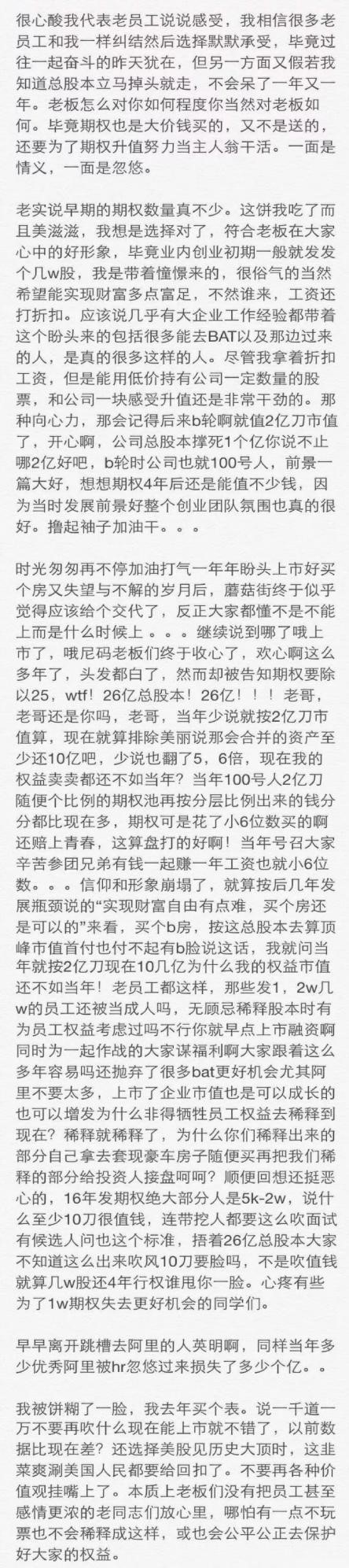 GPLP君注意到,近日,又有蘑菇街老员工匿名发表心酸长文,控诉蘑菇街毫无顾忌稀释股本,当初的承诺现如今成了一纸空谈。