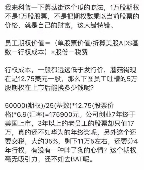 由于行权成本一般都远远低于发行价,换算后的价值都需要除以相应基数,实际价值缩水甚多。根据员工期权价值=(单股票价值/折算美股ADS基数-行权成本)×股份-税费这一公式,假设蘑菇街现在是12.75美元一股,那么该员工吐槽的5万股期权在上市后为50000(期权)/25(基数)*12.75(股票价格)*6.9(汇率)=175900元。